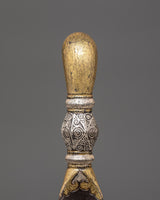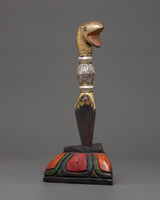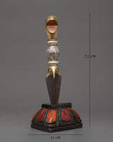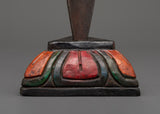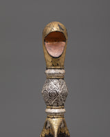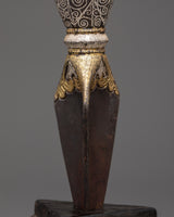 This Phurba is meticulously crafted, with inlays of iron, copper, silver, and brass, each having its symbolic resonance—iron for strength, copper for balance, silver for purity, and brass for heavenly connection. The triple-sided blade depicts the transformation of the three poisons—ignorance, desire, and hatred—to wisdom and compassion. Every detail is a tribute to expert Himalayan craftsmanship, combining beauty and force. Whether used for ritual or spiritual adornment, this Phurba adds a protecting element to any sacred area.