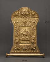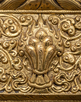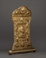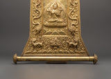 This Brass Metal Thangka includes a wonderfully crafted Manjushri figurine, representing knowledge and enlightenment in Tibetan Buddhism. This Tibetan Buddhist Thangka, measuring 48 cm in height and 38 cm in breadth, is ideal for any area and exudes calm and wisdom. The hand-carved design emphasizes the Majushri's delicate features, while the beautiful brass finish gives the artwork elegance and a golden touch. This Manjushri thangka is beautiful and spiritually significant, whether used for meditation or to decorate a Buddhist altar.
