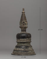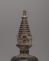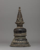 This stupa is a masterpiece, blending brass craftsmanship with an antique finish. It is a sacred object and a stunning visual representation of Buddhist teachings and symbolism. It serves as a reminder of spiritual progress, offering both devotional significance and artistic beauty.