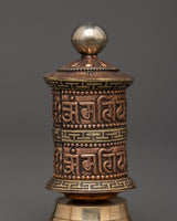 Introduce your area with divine intention using this exquisite Brass Tibetan Prayer Wheel, expertly crafted from copper, brass, white metal, and wood. The sacred "Om Mani Padme Hum" mantra, which is said to radiate blessings, cleanse karma, and bring peace to all beings, appears on this tabletop mantra wheel, which is 10 cm in height and 5.5 cm in width.