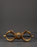 The Brass Vajra Thunderbolt is a strong and symbolic instrument in Tibetan Buddhism and Hinduism, representing spiritual strength, enlightenment, and inner calm. This Tibetan Buddhist ritual tool is 11.5 cm high and 32.5 cm wide, making it an ideal addition to any meditation room or spiritual shrine. This brass Vajra depicts the indestructible essence of wisdom and compassion and the merging of masculine and feminine principles (Vajra and bell). It has long been used in Buddhist ceremonies to invoke spiritual clarity and eliminate ignorance, making it an indispensable tool for meditation practices and spiritual awakening.