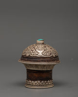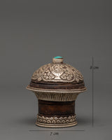 This Brocade Thangka Stick Cap is a beautifully created adornment for Tibetan Buddhist traditions. The cap measures 8 cm high and 7 cm wide, making it ideal for use with thangka scrolls. The cap weighs 0.132 kg, making a total weight of 0.282 kg when combined with its components. It has a hardwood body that ensures longevity and classic authenticity. The cap is wonderfully embellished with pure silver and a turquoise stone at the top, adding spiritual importance and esthetic appeal.