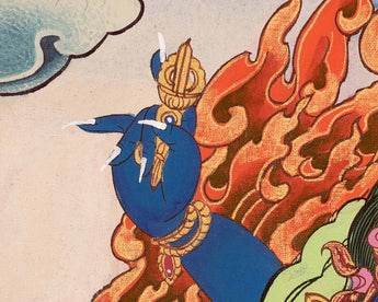 Vajrapani holds a vajra (indestructible thunderbolt) in his right hand, representing his unyielding strength and invincible nature. He is adorned with a garland of snakes, which symbolizes anger transformed by his immense compassion and wisdom.