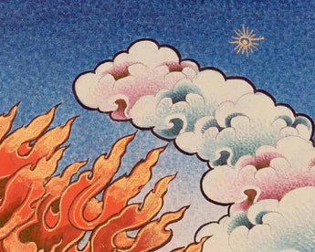 In his standing posture, Vajrapani wears a tiger skin around his waist, symbolizing fearlessness. His hands are positioned in a threatening mudra, emphasizing his authoritative and formidable presence.