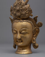 The Buddha head statue is a stunning depiction of Siddhartha Gautama, which is made up of brass the revered spiritual teacher and founder of Buddhism. The figure shows the head of the Buddha, who has closed eyelids and a tranquil look that conveys inner serenity and contemplation. The delicate features of the statue, like the lengthened earlobes, arching eyebrows, and soft curvature of the forehead, all aim to represent the Buddha's awakened knowledge and compassion. The statue is crafted using brass and has complex hand carvings.