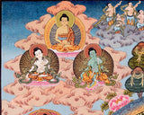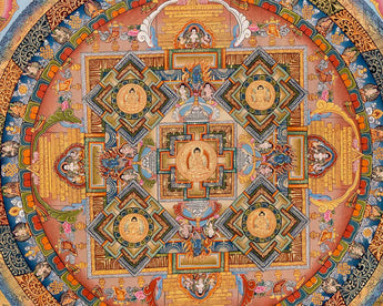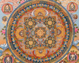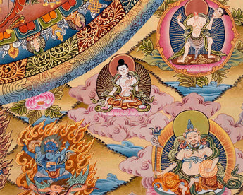 The Buddha Mandala Thangka is a profound representation of Buddhist cosmology, featuring intricate depictions of various deities and symbols. At the center of the mandala sits the Buddha, radiating with serene wisdom and compassion. Above him, the thousand-armed Avalokiteshvara embodies the boundless compassion of the bodhisattva, offering blessings and protection to all sentient beings.