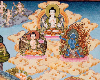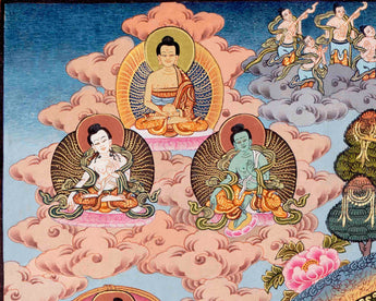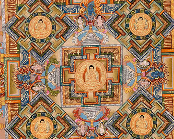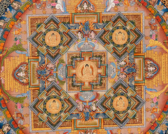 At the bottom of the mandala, powerful deities such as Hevajra, Vajrapani, and Palden Lhamo stand guard, symbolizing protection and empowerment on the spiritual path. Throughout the mandala, depictions of other Buddhas and bodhisattvas adorn the sacred space, each representing different aspects of enlightenment and spiritual attainment.