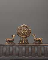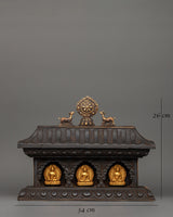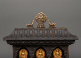 The altar box also depicts a Wheel of Dharma with two deer on both sides, a common Buddhist symbol. It honors the Buddha’s first teaching in Deer Park, Sarnath, where he began imparting his wisdom. The wheel represents Buddhist teachings, while the deer symbolizes peace, kindness, and a willingness to learn. This symbol is often found on Tibetan monastery rooftops as a reminder of wisdom and enlightenment. The golden Buddha figures below enhance the sacred meaning, reflecting devotion to the Buddha’s teachings.