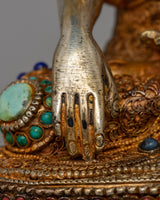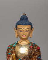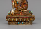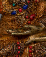 The delicate details of this sculpture capture Buddha Shakyamuni's contemplative atmosphere, making it an excellent complement to any holy place or personal shrine. The bright hues of the semi-precious gemstones and the dazzling gold plating create an astonishing visual harmony that promotes attention and relaxation. The filigree work adds to its visual appeal, making this piece more than just a religious object but also a work of art representing centuries of spiritual and cultural legacy.