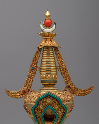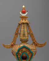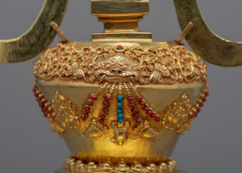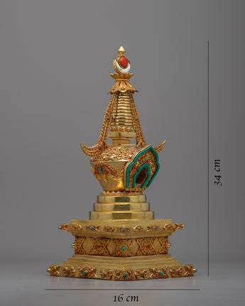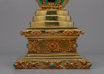 This magnificent Buddhist Chorten is a real work of art, meticulously carved on a Copper body. The stupa is embellished with beautifully placed gemstones, which provide a sense of elegance and brilliance to the design. The entire chorten is plated in 24k gold, giving it a sense of purity and luxury. The rich intricacies and architectural beauty of this religious monument are highlighted by the chorten-style craftsmanship. This Buddhist Chorten serves as a treasured reminder of devotion and reverence as a symbol of spiritual enlightenment and a place of prayer. Its presence adds a sense of calm and serenity to any environment, making it a treasured addition to any Buddhist collection or spiritual setting.