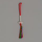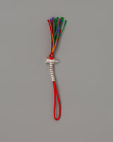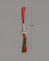 This Buddhist Chupsel Mala Counter is a cherished Tibetan tool to record mantra recitations on a mala during meditation or prayer. With its symbolic miniatures of the bell (ghanta) and vajra (Dorje), which stand for wisdom and compassion, the two foundations of enlightenment in Vajrayana Buddhism, this 11-centimeter piece is expertly created from 90% silver. A scarlet thread and a colorful, multicolored tassel embellish each counter, giving your practice an auspicious touch.