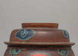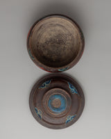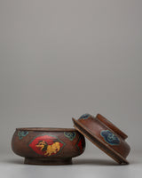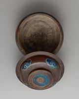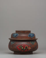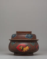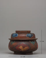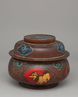 This Buddhist Champa Pot is an elegant and valuable item expertly decorated by talented artisans and made from robust wood. It is perfect for rituals, sacred storage, or serving as the focal point of your spiritual altar due to its construction and vibrant hand-painted decorations. This 1.24 kg pot adds a colorful, protective energy to any space while showcasing the incredible tradition of Tibetan art.