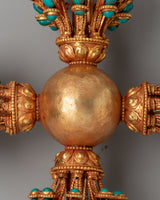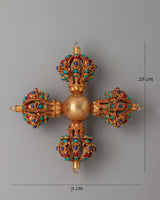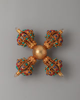 This Buddhist Double Vajra (Bishwo Vajra) is an artistically created ceremonial artifact that stands 28 cm tall and 9 cm at the base and weighs 0.782 kg. This religious piece is made of excellent copper and plated with gold. It is embellished with artificial gemstones such as coral, turquoise, and lapis lazuli. The gold-plated surface adds to its longevity and spiritual significance, making it a prized treasure for Buddhist practitioners and collectors. This Bishwo Vajra, with its intricate craftsmanship and rich symbolism, makes an excellent centerpiece for spiritual areas, meditation rooms, and Buddhist shrines.