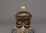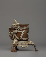 Kapalas have traditionally been used in Buddhist and tantric ceremonies to represent the transient nature of life and the change of material existence into spiritual enlightenment. This piece is made using various traditional metalworking techniques, with silver-plated accents that provide a rich contrast to the oxidized copper body. The rich facial features, with detailed carvings, highlight Tibetan artists' careful craftsmanship, making this a compelling treasure to exhibit. Whether displayed in a meditation room, shrine, or collection of spiritual objects, this Buddhist Skull Kapala serves as a reminder of death, spiritual wisdom, and Tibetan Buddhism's profound teachings.
