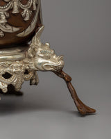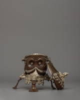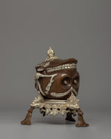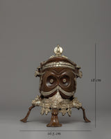 The Buddhist Handmade Skull Kapala is a stunning example of Tibetan workmanship, carefully crafted from oxidized copper with silver-plated ornaments. This Kapala, 18 cm tall and 16.5 cm broad, has an intricate construction with well-carved elements that give it a distinct and forceful presence. The top of the Kapala is ornamented with a half vajra, representing the indestructibility of knowledge in Buddhist philosophy. The frightening yet captivating skull-like visage is enhanced by sharp, symmetrical features that evoke the idea of impermanence and spiritual transformation. This Kapala, supported by three complex leg-like extensions covered with exquisite designs, is a colorful ceremonial instrument that symbolizes the depths of Tibetan Buddhist traditions.