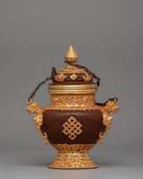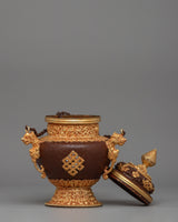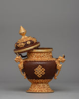 Crafted from oxidized copper and electroplated in gold, this stunning Buddhist hanging incense burner is a wonderfully constructed ritual item. This elaborately crafted censer, which is 51 cm in height (22 cm without the chain) and 17 cm in breadth, is embellished with auspicious Buddhist symbols, such as the endless knot, which stands for boundless wisdom and interdependence. Incense is ideal for meditation, symbolic purification, and spiritual offerings in temples, shrines, or home altars, owing to its hanging chain design, ensuring even and smooth burning.