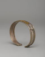Feel the powerful energy and spiritual importance of this wonderfully handmade Buddhist Healing Bracelet. This bracelet is made of white metal and contains a detailed etching of the sacred mantra "Om Mani Padme Hum" in a gorgeous gold-tone overlay. The vajra carved on the sides lends an artistic touch, making it a classic item for meditation or everyday use. With its lightweight design (just 20g) and adjustable cuff style, this bracelet is suitable for wrist sizes, providing both elegance and functionality.