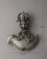 The Buddhist Iron Kartika Knife is an intricately hand-carved artifact with deep spiritual significance in Tibetan Buddhism. Crafted from iron, this sacred blade features a flat, sharpened edge with a curved hook at its outer extremity, symbolizing the ability to cut through ignorance and attachment. The Makara, a mythical sea creature, is prominently displayed with its mouth wide open, appearing to hold the blade, signifying protection and transformation. Atop the handle, a half-vajra is present, symbolizing indestructibility and enlightenment. The combination of these elements makes this Kartika knife a decorative masterpiece and a symbolic representation of spiritual awakening in Buddhist traditions.