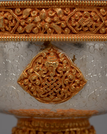 The Buddhist Offering Bowl Set is evidence of the fine workmanship and profound spiritual meaning found in Tibetan Buddhist practices. Each of the seven bowls in the set evokes luxury and reverence. They are expertly carved on copper bodies and lavishly plated in 24k gold and silver. In addition to being vessels, these bowls are also symbols of devotion that are offered to enlightened beings in order to gain merit and promote spiritual development.