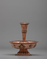 The Serkyem is designed to be symbolic and purposeful, with two different but harmonized sections. The wide, flat bowl-shaped base indicates stability and receptiveness, while the top, shaped like a Buddhist butter lamp, represents the offering of light and wisdom. Together, they form a vessel with great spiritual meaning. During rituals, the sacred drink pours from the top to the bottom, representing the deities' endless generosity and compassion. The craftsmanship exemplifies wonderful Buddhist aesthetics, highlighting its dual position as a sacred object and a work of art. This Serkyem acts as a link between the physical and divine realms, making it a vital complement to any spiritual practice.
