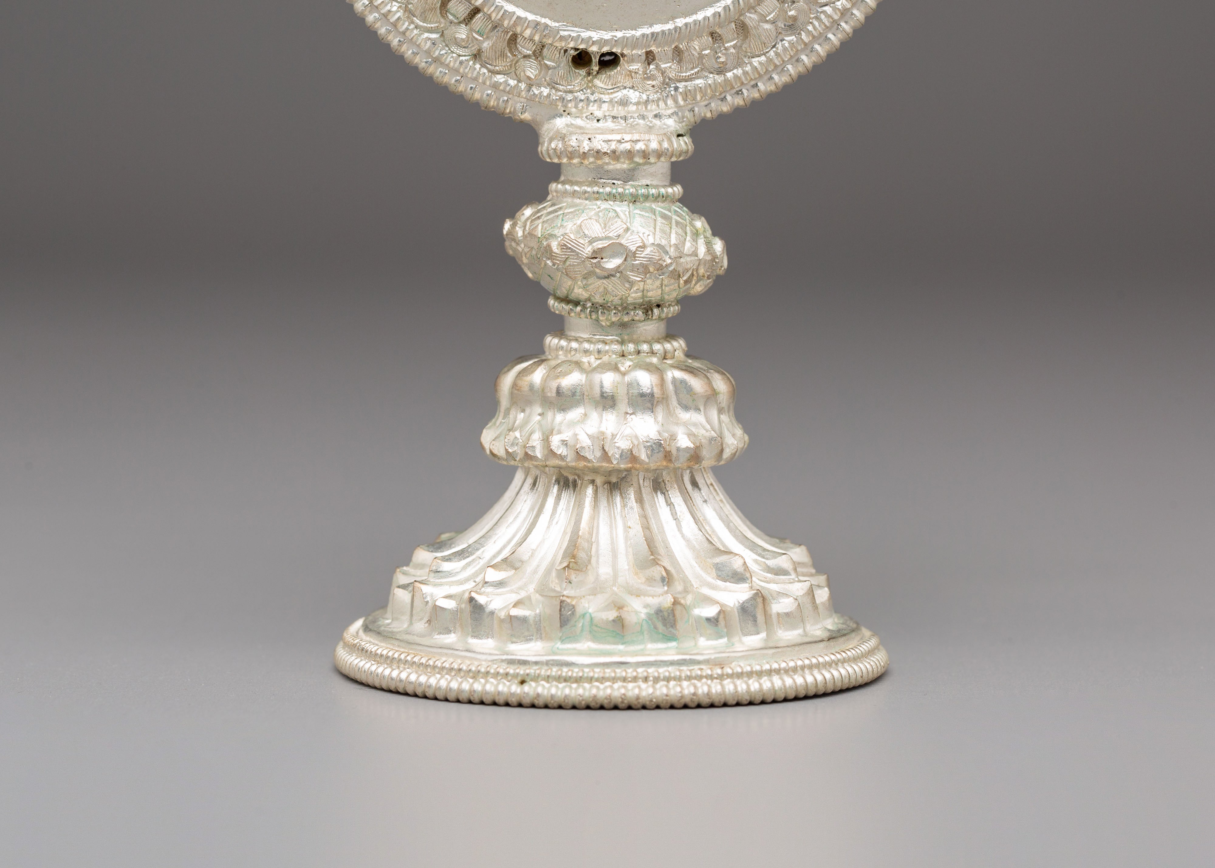 The border features graceful, petal-like patterns and traditional embossed elements associated with purity and spiritual insight. The tiered base adds depth to its symbolic value, representing reverence, offering, and focused intention during rituals. These artistic features highlight the skilled craftsmanship often found in Tibetan ceremonial objects, contributing to the mirror’s elegant spiritual character.