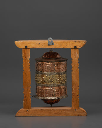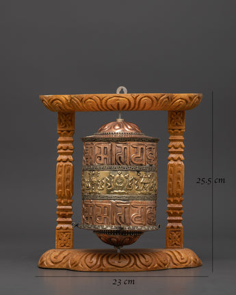 The body, crafted from copper and brass, is both significant and highly detailed, weighing 0.78 kg. This prayer wheel is designed to spin smoothly within its elegant wooden frame, enhancing the spiritual ambiance of any altar, shrine, or meditation space.
