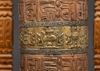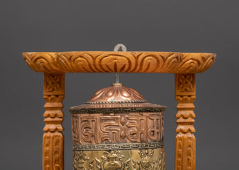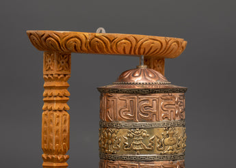 Bring significant spiritual significance into your sacred area with this Buddhist Sacred Prayer Wheel and Brass Prayer Wheel, a potent instrument for Tibetan Buddhist meditation. This prayer wheel measures 25.5 cm in height and is framed by a finely carved wooden construction. It is written with sacred mantras and elaborate symbols for ultimate spiritual benefits.