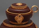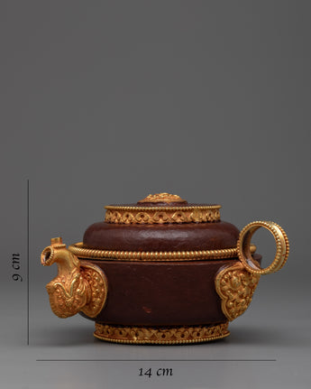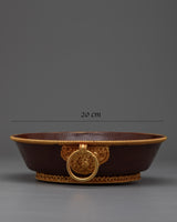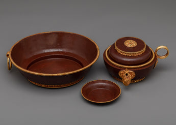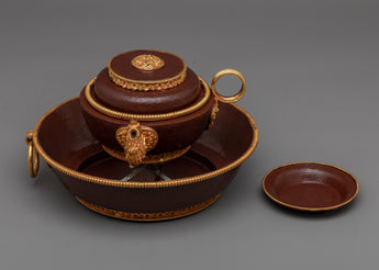 Elevate your sacred rituals with the magnificent Dzambhala Buddhist Water Offering Set, which is expertly created from oxidized copper and embellished with sumptuous 24k electro gold plating. This set includes three key components: a water pot, a large plate-type bowl, and one tiny bowl, all of which are precisely crafted to enhance the holiness of your ceremonies.