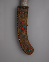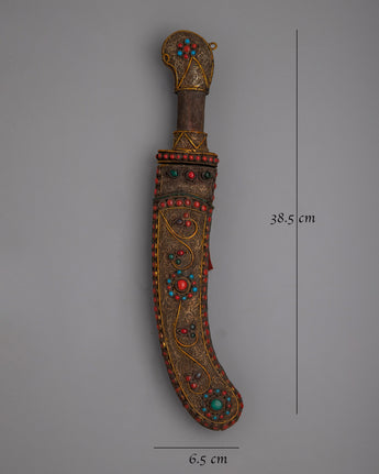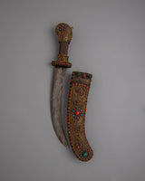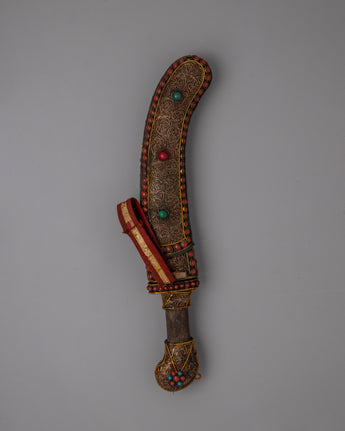 The white metal construction gives a strong and long-lasting foundation, though the coral and turquoise stones add brilliant color and complex craftsmanship. These stones are frequently connected with protection, healing, and spiritual clarity in Buddhist cultures. This knife's design symbolizes a rich cultural legacy, and its exquisite craftsmanship makes it an excellent addition to any collection of sacred things or a meaningful instrument for spiritual practice. Its graceful and symbolic nature makes it an effective reminder of Buddhism's ideals and teachings.
