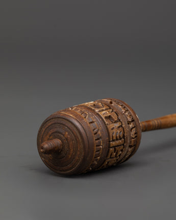 A prayer wheel is a cylindrical device on a spindle, used in Tibetan Buddhism. It is typically inscribed with the mantra "Om Mani Padme Hum" and rotated by hand as a form of spiritual practice and to accumulate merit. Spinning the wheel is believed to have the same spiritual benefits as reciting the mantra verbally. The use of prayer wheels is widespread in Tibetan Buddhism and has spread to other cultures.