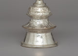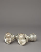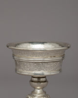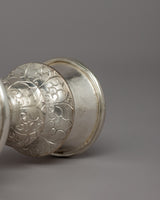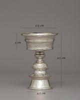 This copper butter lamp set for the altar is plated in silver. Each lamp measures 9.5 cm in height and 6.5 cm in diameter and features intricate floral carvings that add decorative and spiritual value. The 3 cm inner depth allows for a small amount of oil or ghee, traditionally clarified yak butter or ghee, to be placed inside.