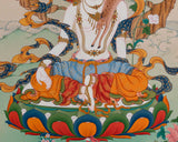 Crafted with unparalleled mastery and devotion by skilled Tibetan artisans, this exquisite thangka transcends traditional boundaries, offering a unique portrayal of Chenresig, the embodiment of boundless compassion, alongside the radiant presence of Buddha Amitabha, the Buddha of Infinite Light.