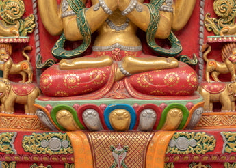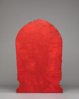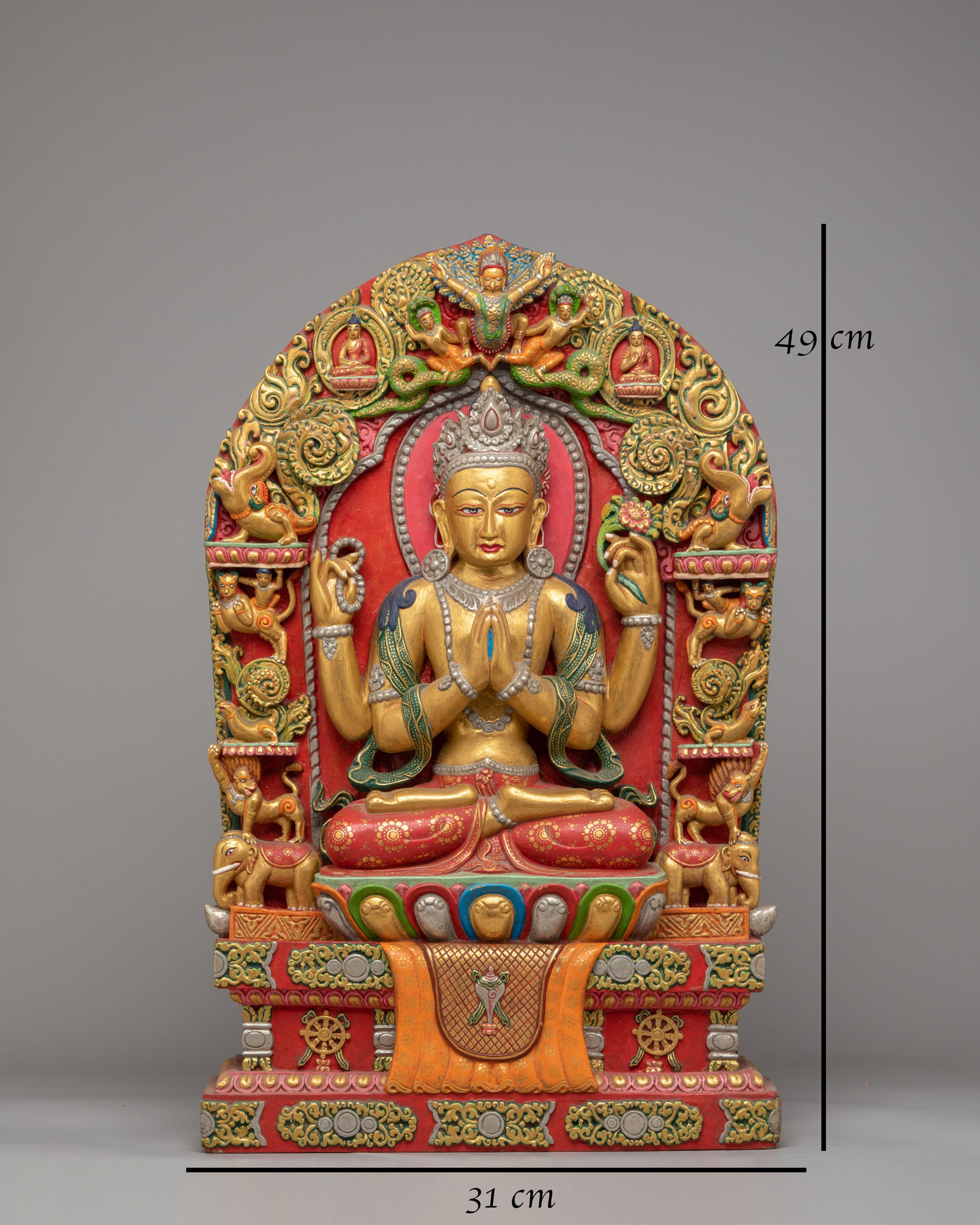 This Chenrezig Bodhisattva of Compassion Figurine is an exquisite depiction of Chenrezig, the venerated Bodhisattva of Compassion in Tibetan Buddhism. Standing 49 cm tall and 31 cm wide, this sculpture is masterfully carved from wood, with detailed 24K gold plating and acrylic colors that add to its visual appeal. Chenrezig, also known as Avalokiteshvara, is the embodiment of limitless compassion, and this monument serves as a reminder of the value of love, generosity, and empathy for all living beings.