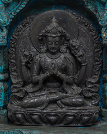 The design presents Chenrezig seated in a meditative pose, framed by an ornate arch decorated with flowing motifs and expressive carvings. The Bodhisattva’s four arms represent compassion and the wish to support all beings, while the calm posture conveys serenity and clarity. The detailed lotus seat and halo behind Chenrezig emphasize purity and awakened understanding. The surrounding arch, enriched with sculpted patterns and textured surfaces, adds depth and character, drawing the eye toward the central figure.