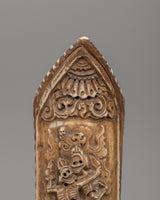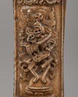 Our 15.5cm tall and 4.5cm broad Chitipati wall décor is expertly crafted from ethically obtained buffalo bone, which was chosen for its profound spiritual meaning and natural connection. The buffalo bone represents power, durability, and earthy protection, making it an ideal material for this Chitipati statue, a Buddhist god known for his ability to transform bad energy and protect practitioners from harm. This Chitipati wall decor's modest size makes it excellent for meditation spaces, altars, or any other spiritual practice place, where it can serve as a continual reminder of heavenly protection and spiritual enlightenment.