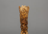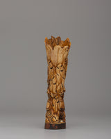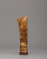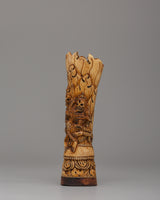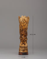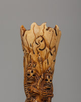 The Chitipati Mahakala statue, made of ethically obtained buffalo bone, measures 16.5 cm tall and 5 cm wide. This tiny yet powerful sculpture depicts the wrathful deity Chitipati, who is associated with protecting holy sites and destroying evil forces. The elaborate carving on the bone creates a sense of strong spiritual force, and the figure's rich, expressive face evokes heavenly strength and fierce compassion.
