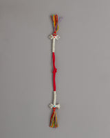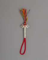 The Chupsel Counter has a red cord loop at the top that can be easily attached to a mala (prayer beads) or used as an ornament in a ritual ensemble. This feature transforms it into a spiritual practice tool and a lovely accessory that can be carried or worn alongside a mala. The multicolored tassels hanging from each end add a colorful, vibrant touch while representing Tibetan Buddhism's various aspects of spiritual practice. The beads represent the sacred connection between the practitioner and the divine, and their polished and radiant finish exudes purity and sanctity with a bell and half vajra above the tassel. These silver beads are not only visually appealing, but they also add to the spiritual resonance of the Chupsel, which is intended to help practitioners keep track of their recitations, chants, or mantras during meditation sessions.