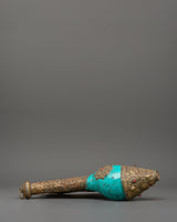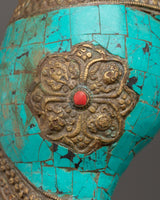 This ritual conch shell is expertly carved and features exquisite turquoise and coral stone inlays and copper filigree work. It weighs 1.606kg and has a solid feel, making it an appropriate focus for Buddhist rituals, temple offerings, or sacred music ceremonies. This Tibetan conch denotes divine blessings and positive energy, making it suitable for spiritual practice, decoration, or as a kind gift.