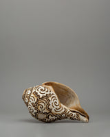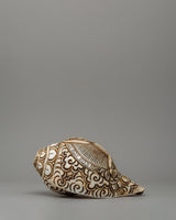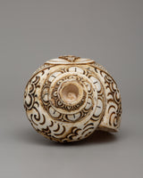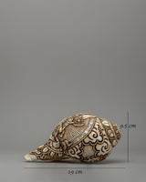 This conch shell with White Tara carvings measures 9.5 cm in height and 19 cm in width and features a beautifully intricate carving of White Tara, the Buddhist goddess of compassion and healing. White Tara is depicted in a seated posture, her serene expression and graceful demeanor embodying her qualities of benevolence, peace, and protection. The carving captures the subtlety of her form, with her delicate features and detailed attire standing out on the surface of the conch shell. White Tara is known to bestow long life and relieve suffering, making this conch not only a work of art but also a potent spiritual tool.