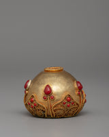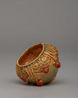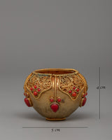 This elegant gold-plated copper bowl with filigree and coral stones is a stunning representation of individual abilities. It is decorated with colorful imitation coral stones and elaborate filigree work. At 4 cm in height and 5 cm in breadth, it is the ideal complement to any altar, home décor, or sacred area. This lightweight Golpa bowl, which weighs only 0.044 kg, represents the rich tradition of traditional craftsmanship and reflects elegance and nostalgic appeal.