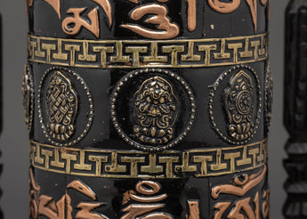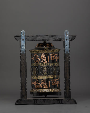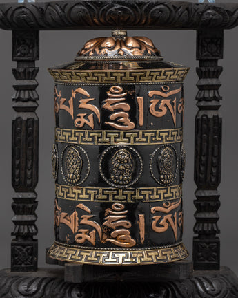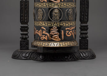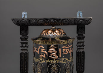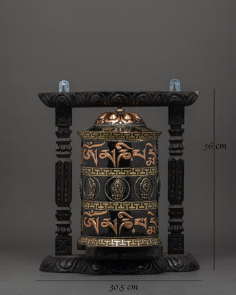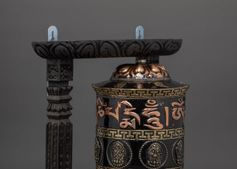 This large, handcrafted copper and Brass Prayer Wheel, a finely produced sacred object with traditions in Tibetan Buddhist culture, can help you channel profound spiritual energy. This prayer wheel, which stands 36 cm tall and 30.5 cm wide, features elaborate mantra engravings set within an elegantly carved black hardwood frame, making it an ideal focal point for any meditation room or shrine.