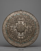 The Copper Buddhist Mandala Thangka Wall Hanging, meticulously handcrafted from copper and silver-plated, illustrates the intricate beauty of Buddhist symbolism. The silver plating highlights the intricate patterns, encouraging meditation and reflection on the universe's harmony and interconnectedness.