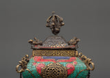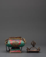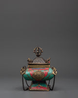 This hanging incense burner has a total height of 33cm (with chain), a height of 16cm without chain, and a width of 13cm. It weighs 0.58kg. It is meticulously created from copper and adorned with artificial turquoise and coral stones. Its exquisite shape and weight make it an excellent choice for hanging on altars, shrines, or temple ceilings, filling the room with the sacred fragrance of ceremonial incense and creating a pleasant, relaxing atmosphere.