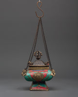 Copper Hanging Incense Burner with Turquoise & Coral Inlay | Ritual Incense Burner