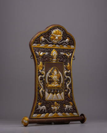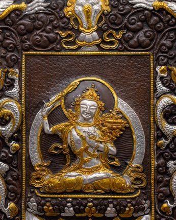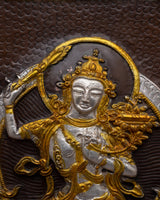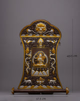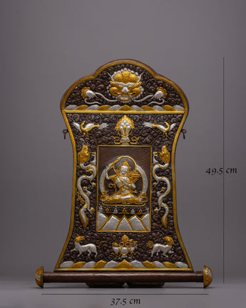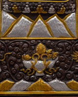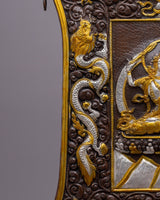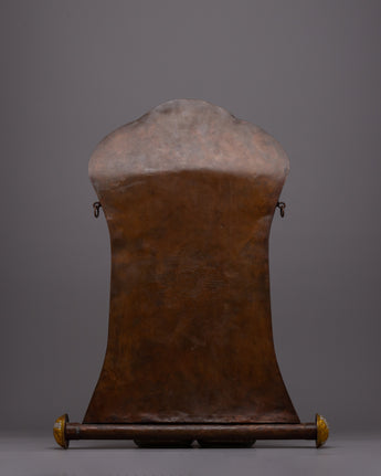 Discover the spiritual essence of our Handmade Copper Metal Thanka Wall Hanging, which is beautifully formed on an oxidized copper body and electro plated in silver and gold. This magnificent work, which weighs 1.38 kg and measures 49.5 cm in height by 37.5 cm in breadth, embodies both creative brilliance and cultural relevance.