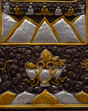 This elaborate artwork is set on a rich backdrop of oxidized copper, which is enhanced with sparkling silver and electro gold plating accents. This Thanka wall hanging, which features traditional designs and symbols that represent enlightenment and spiritual lessons, is a monument to the skill of Tibetan artists. This Handcrafted Copper Metal Thanka Wall Hanging brings a sense of reverence and tranquility to any area, whether it is used as a centerpiece in your house or in a meditation room. It encourages meditation and believed.