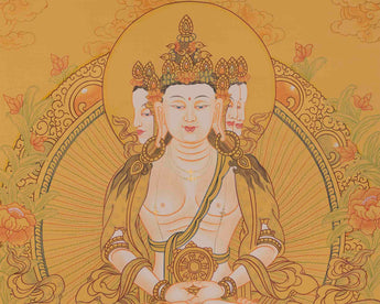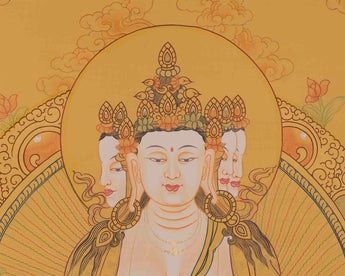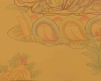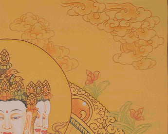 In this thangka, Vairocana is typically depicted in a seated posture, known as the dhyanasana or meditation posture, with legs crossed and hands resting on the lap in the dhyana mudra, symbolizing meditation. Vairocana's distinguishing characteristics include a serene expression, with eyes half-closed in deep contemplation, reflecting inner tranquility and profound insight.