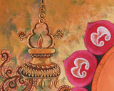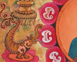 The brilliant colors of pink, blue, and red tones, complemented with a golden hanging lamp symbolizing wisdom and traditional guardians for protection, bring peace and transformation to life. This artwork, printed in Giclée on cotton canvas, effortlessly integrates traditional Buddhist iconography with modern craftsmanship, creating a timeless piece for meditation or sacred settings.