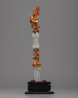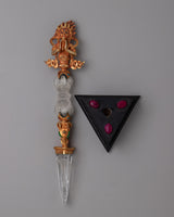 Presenting the Crystal Phurba, a magnificent example of spiritual artistry and painstaking crafting. This gorgeous phurba, which is handcrafted on a copper body and electroplated in gold, is embellished with crystal and rubies and comes with a wooden base stand. Standing 31.5 cm tall and 10.5 cm wide, weighing 0.476 kg, this work is visually striking and rich in symbolism.