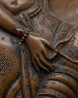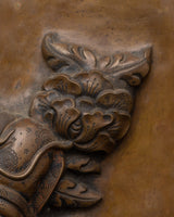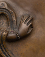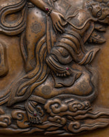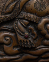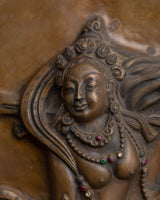 This Dancing Deity Brass Wall Hanging, a beautiful work of Himalayan art, will bring heavenly movement and spiritual energy into your area. This elaborately carved brass, 41cm tall and 35cm wide, depicts a dancing deity, likely a kind of Dakini or divine goddess, surrounded by flowing clouds. At 1.95kg, it stands out on any spiritual wall or altar. The deity is seen in the Jnana Mudra, or "gesture of knowledge," with the right hand holding the stem of a lotus. The right leg is gracefully extended upward, while the left leg gently steps on the clouds.